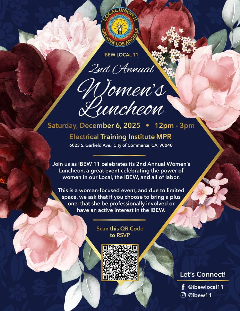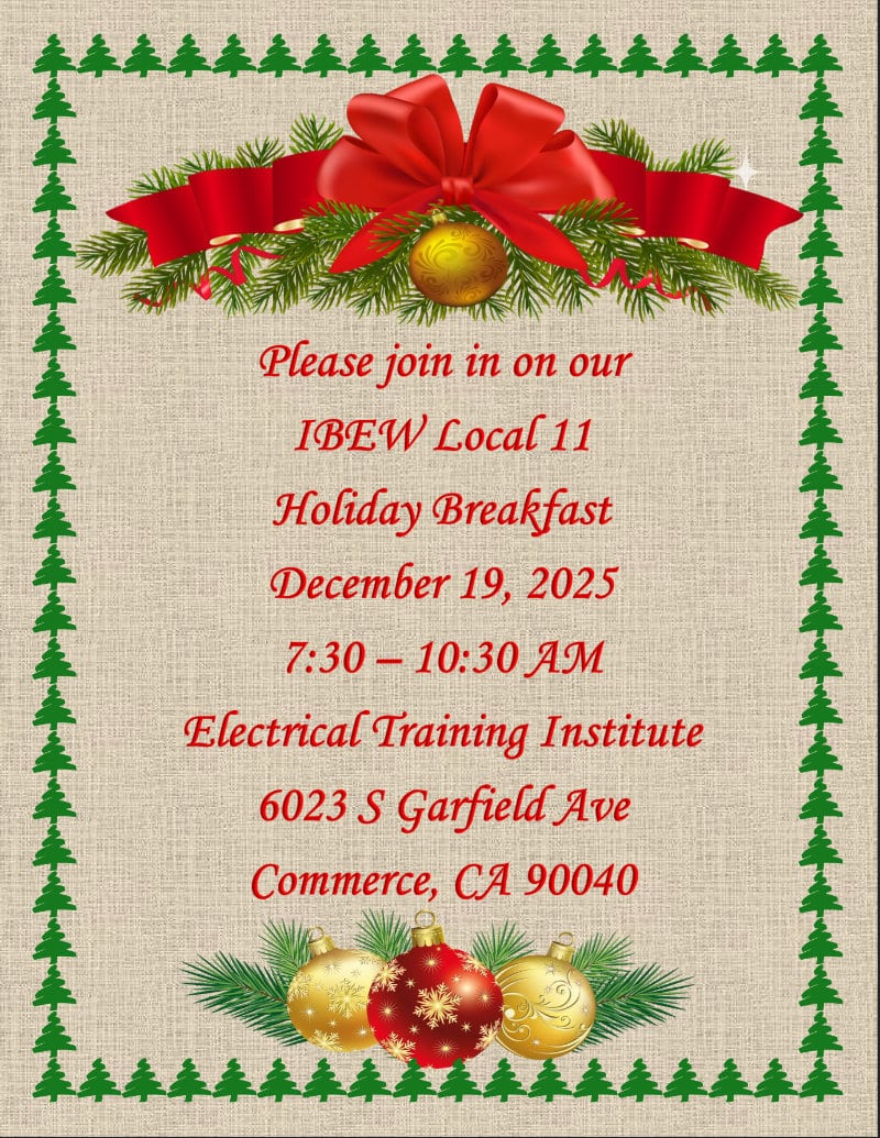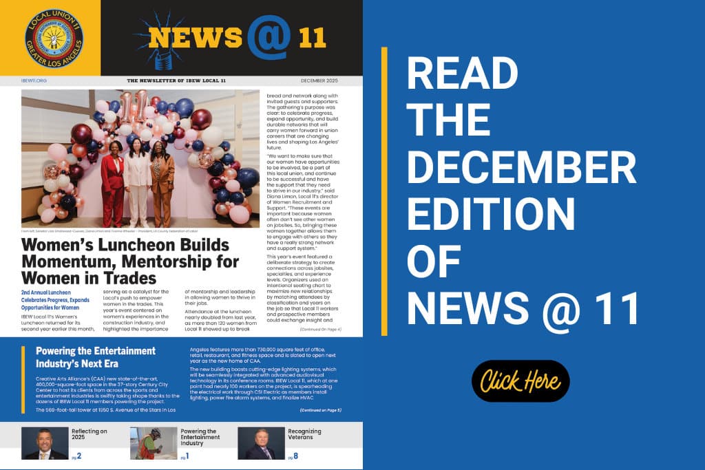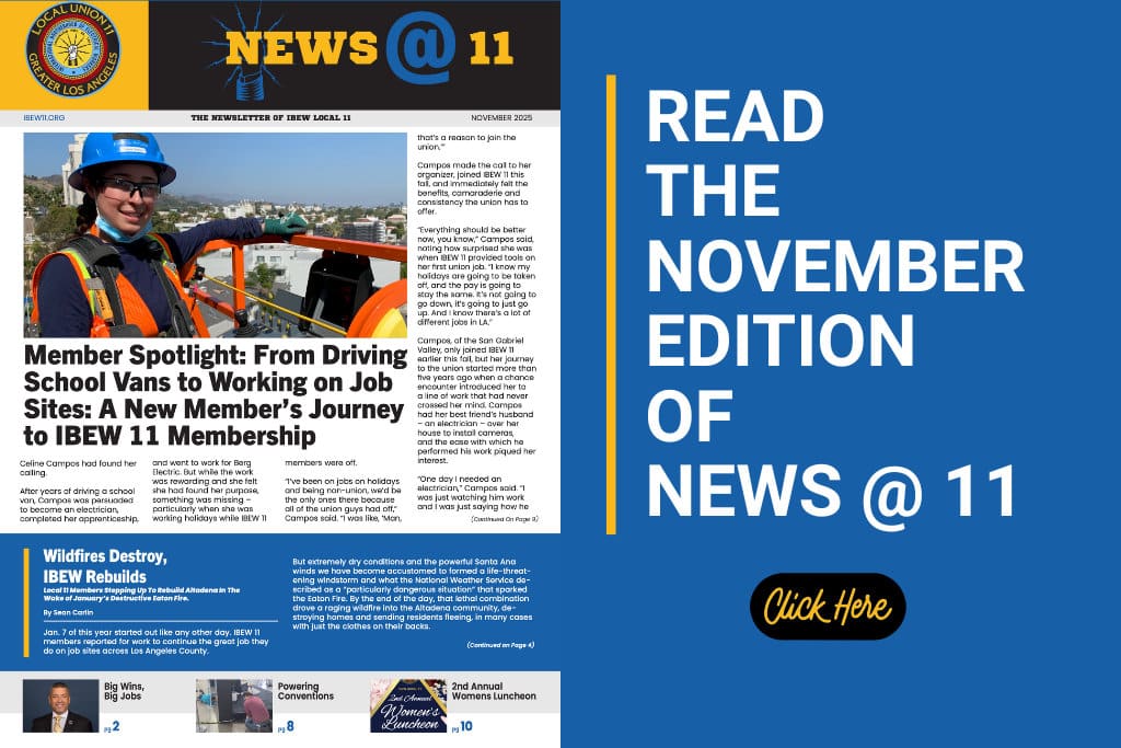 Watch Video Details in News@11 Union Picnic All Sun and Fun At the IBEW 11 Learn More TO NOT BE OK Here are tools to help you reset, recover, and build A path to mental wellbeing. ITS OK Take the first step. We’ve got your back. ICE Raids, Know Your Rights Standing Up for Read More Immigrant Rights Learn More Compton High School Local 11 Brings to Life 3rd Wednesday of Every Month Ibew local 11 Learn More we're here for you Recovery group UPCOMING EVENTS LATEST NEWS IBEW 11 November 2025 Edition of News @ 11 November 21, 2025 Click here to read the November 2025 Edition of News @ 11 learn more IBEW 11 · newsletter IBEW 11 | News Volunteers Needed – Help Rebuild Our Community November 6, 2025 IIBEW Local 11 is partnering with Habitat for Humanity to help rebuild homes in Altadena that… learn more Community Involvement · IBEW 11 · volunteer News @ 11 October 2025 Edition of News @ 11 October 22, 2025 Click here to read the October edition of News @ 11 featuring YES on Prop 50;… learn more Agent Reports · Annual Picnic · IBEW Local 11 Picnic and Health Fair · News@11 · Organizing Reports · Prop 50 · Tradeswomen Build Nations conference Happy Holidays: Looking Back at 2024Happy Holidays to our entire IBEW 11 family. This is such a special time of year for celebrating all that we have achieved over the past year, and for wishing you all the best from our union family to yours. …Learn More Completing LAX’s Automated People MoverIt’s one of LA’s highest profile construction projects – the LAX Automated People Mover (APM). The centerpiece of the airport’s $30 billion upgrade, the People Mover is now scheduled to open in 2026, in time for the World Cup and 2028 Olympics. …Learn More Taking care of yourself this holiday seasonSo, here we are again. Another Holiday season. For some, it’s a time to spend with friends and family making more memorable moments. And then for others, it’s the most trying time of the year. …Learn More CAMPAIGNS It’s OK to Not Be OKLearn More Empowering Women in the TradesLearn More Green IBEWJobsLearn More Go to Campaigns Page Find Out More About IBEW Local 11 OFFICERS EXECUTIVE BOARD EXAMINING BOARD BYLAWS DEARLYDEPARTED FAQ