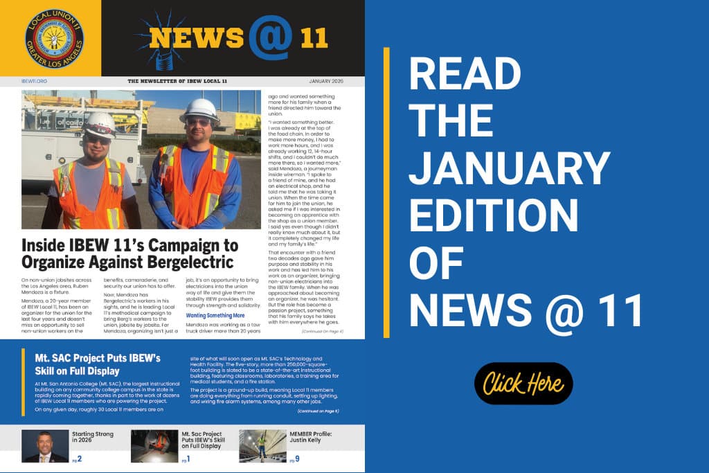 Details in News@11 Union Picnic All Sun and Fun At the IBEW 11 Learn More TO NOT BE OK Here are tools to help you reset, recover, and build A path to mental wellbeing. ITS OK Take the first step. We’ve got your back. ICE Raids, Know Your Rights Standing Up for Read More Immigrant Rights Learn More Compton High School Local 11 Brings to Life 3rd Wednesday of Every Month Ibew local 11 Learn More we're here for you Recovery group UPCOMING EVENTS LATEST NEWS IBEW 11 January 2026 Edition of News @ 11 January 15, 2026 Click here to read the January 2026 Edition of News @ 11 learn more IBEW 11 · News@11 · newsletter IBEW 11 December 2025 Edition of News @ 11 December 18, 2025 Click here to read the December 2025 Edition of News @ 11 learn more IBEW 11 · News@11 · newsletter IBEW 11 November 2025 Edition of News @ 11 November 21, 2025 Click here to read the November 2025 Edition of News @ 11 learn more IBEW 11 · News@11 · newsletter Happy Holidays: Looking Back at 2024Happy Holidays to our entire IBEW 11 family. This is such a special time of year for celebrating all that we have achieved over the past year, and for wishing you all the best from our union family to yours. …Learn More Completing LAX’s Automated People MoverIt’s one of LA’s highest profile construction projects – the LAX Automated People Mover (APM). The centerpiece of the airport’s $30 billion upgrade, the People Mover is now scheduled to open in 2026, in time for the World Cup and 2028 Olympics. …Learn More Taking care of yourself this holiday seasonSo, here we are again. Another Holiday season. For some, it’s a time to spend with friends and family making more memorable moments. And then for others, it’s the most trying time of the year. …Learn More CAMPAIGNS It’s OK to Not Be OKLearn More Empowering Women in the TradesLearn More Green IBEWJobsLearn More Go to Campaigns Page Find Out More About IBEW Local 11 OFFICERS EXECUTIVE BOARD EXAMINING BOARD BYLAWS DEARLYDEPARTED FAQ