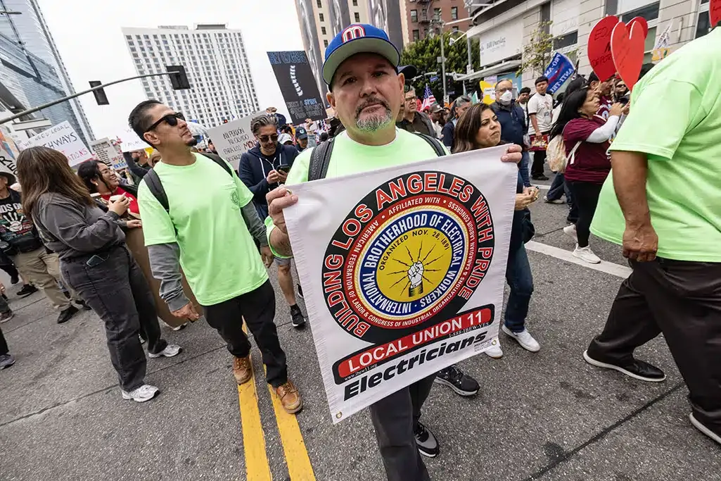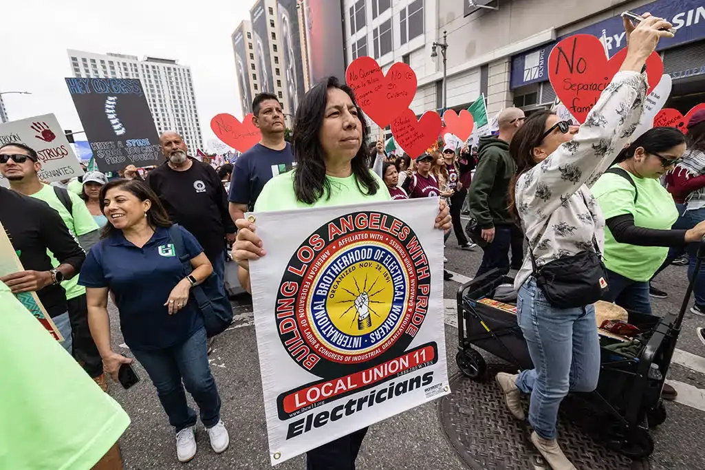 More than a dozen Local 11 members joined their union brothers and sisters at the rally and march that began at 9 am at LA Live, near Crypto Arena, then marched several miles to the Federal Building where the ICE offices are located.